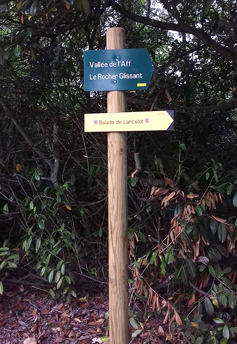 Se garer sur le parking, puis suivre les marques jaunes — Vallée de l’Aff.Ensuite, vous allez arriver sur un panneau : La balade de Lancelot (marquage bleu). Suivre les indications.